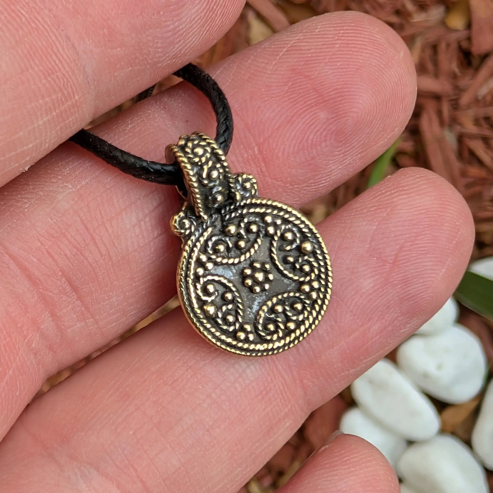 This handcrafted pendant is inspired by early medieval Nordic metalwork from the 9th–12th century, a period known for refined granulation and filigree techniques in Scandinavian and Baltic jewelry.