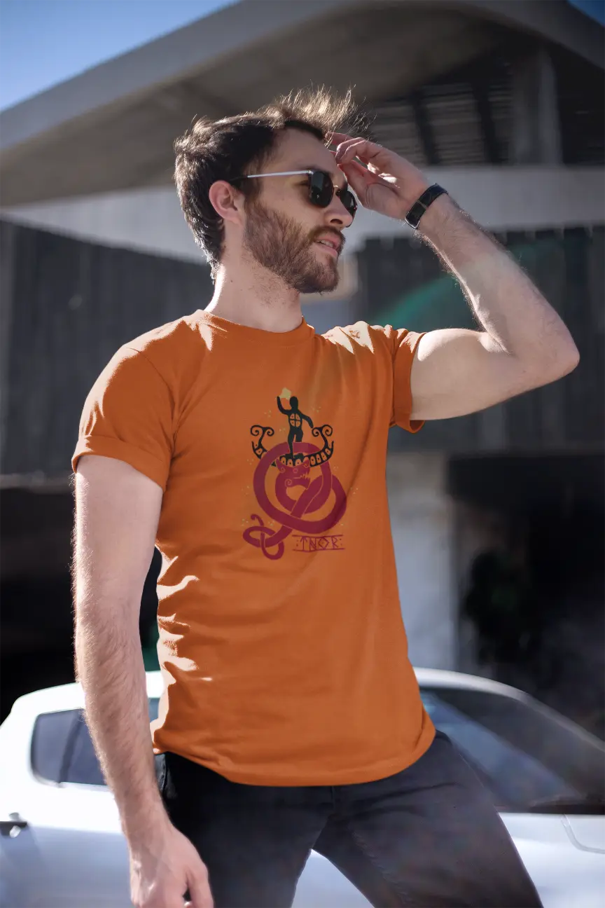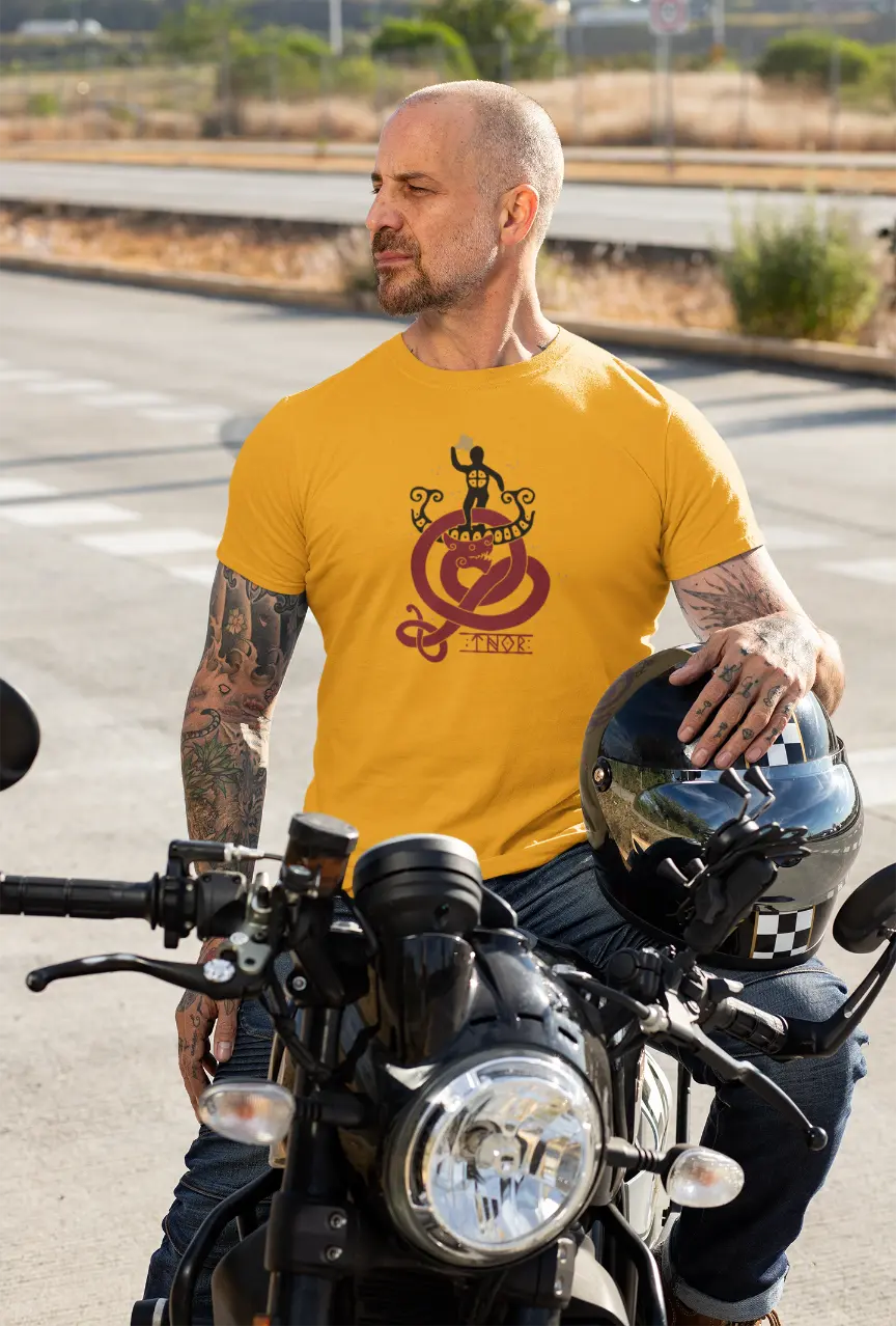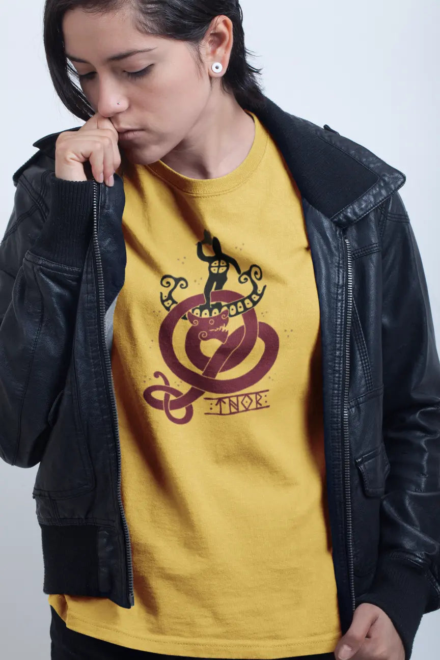 This unisex T-shirt from LostRavn Fashion captures the dramatic climax of Norse mythology—Thor’s final battle during Ragnarok. Wielding Mjolnir, the thunder god confronts Jormungandr, the World Serpent, in a duel that shakes the cosmos. Though Thor strikes down the great serpent, he takes only nine steps before succumbing to its venom, marking both the end of the old gods and the dawn of a new world.