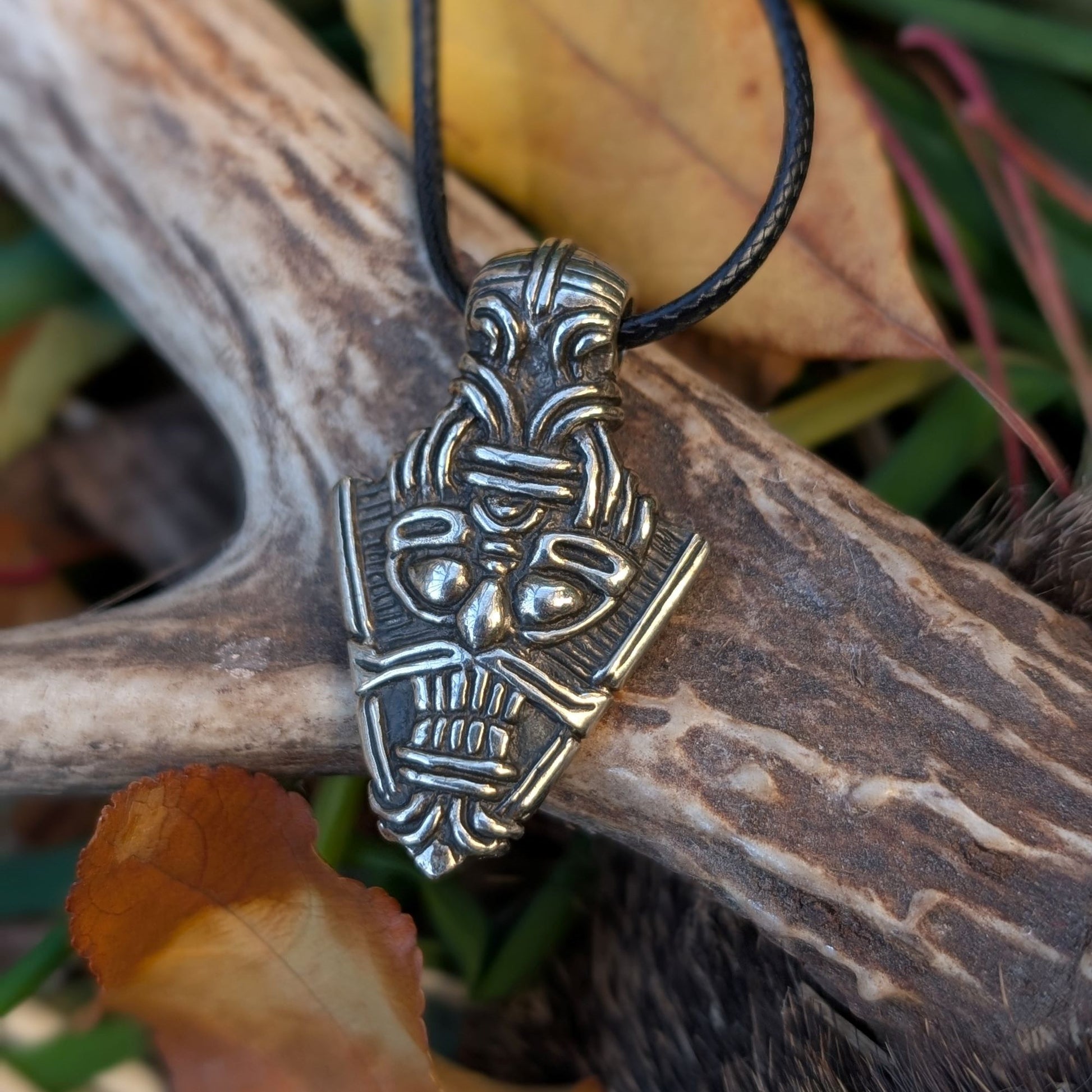 This pendant represents the stylized face of Odin, the Allfather, depicted in a form inspired by early Viking Age metalwork. The elongated mask-like design, interlaced beard, and abstract facial lines reflect the carved and cast motifs found across 9th–11th century Scandinavian artifacts.