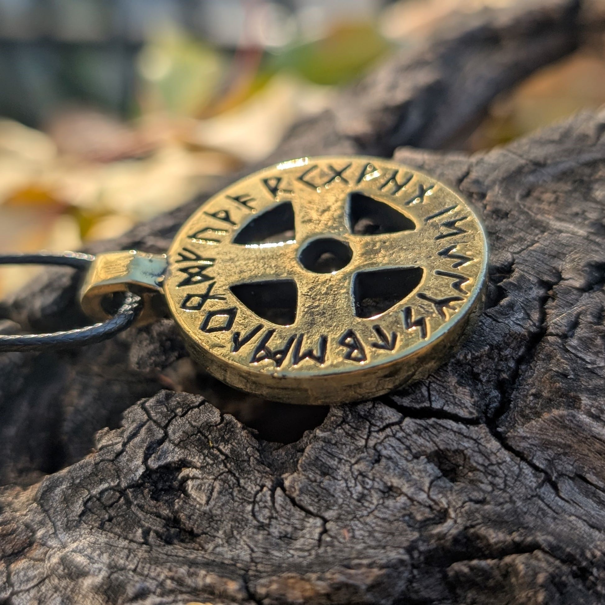 Cast by artisans in bronze or pewter, the pendant features a polished face side and a full runic alphabet around the edge. The runes were traditionally used to focus intent, guide decisions, and offer a layer of protective meaning to amulets.