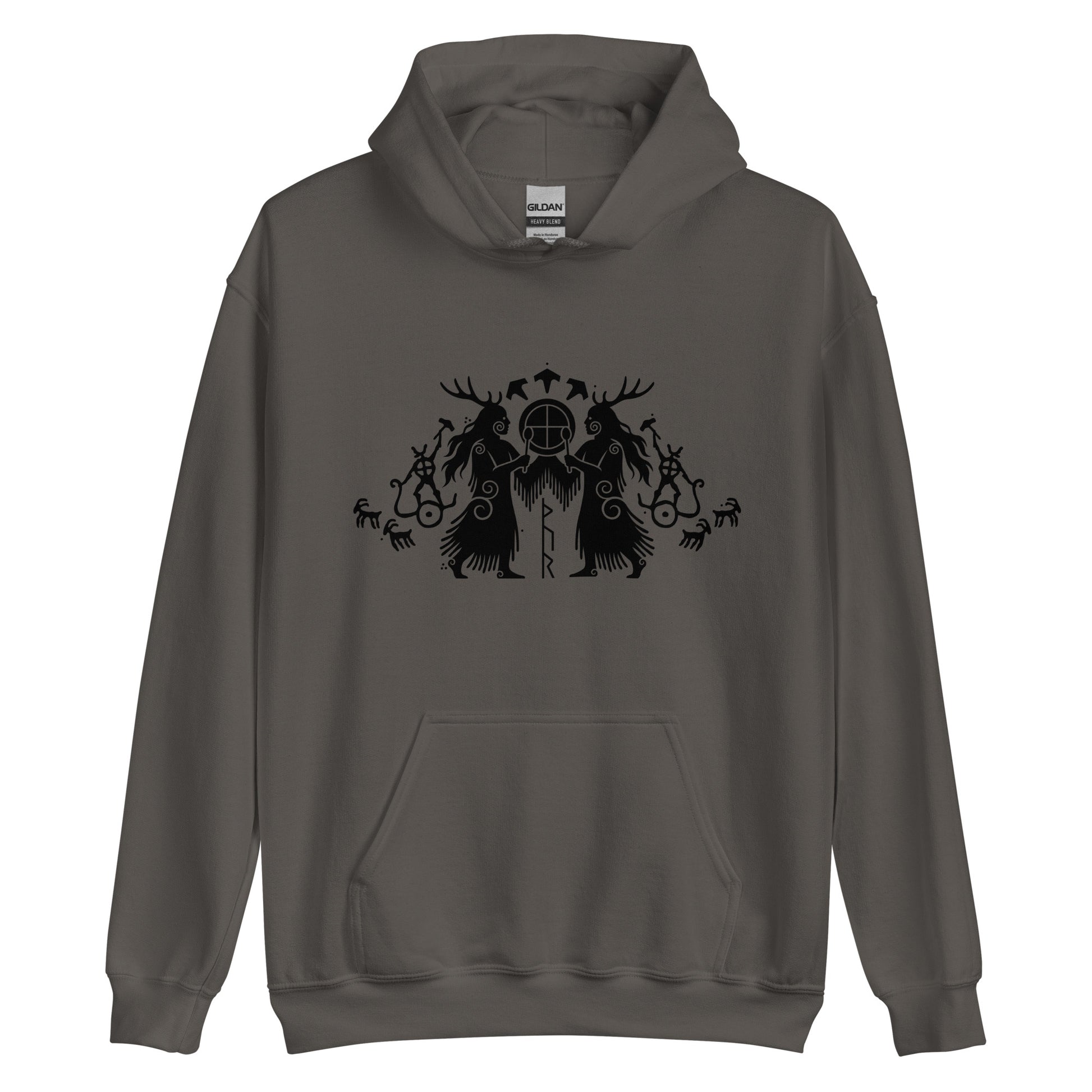 Pullover hoodie with Norse-inspired graphic.